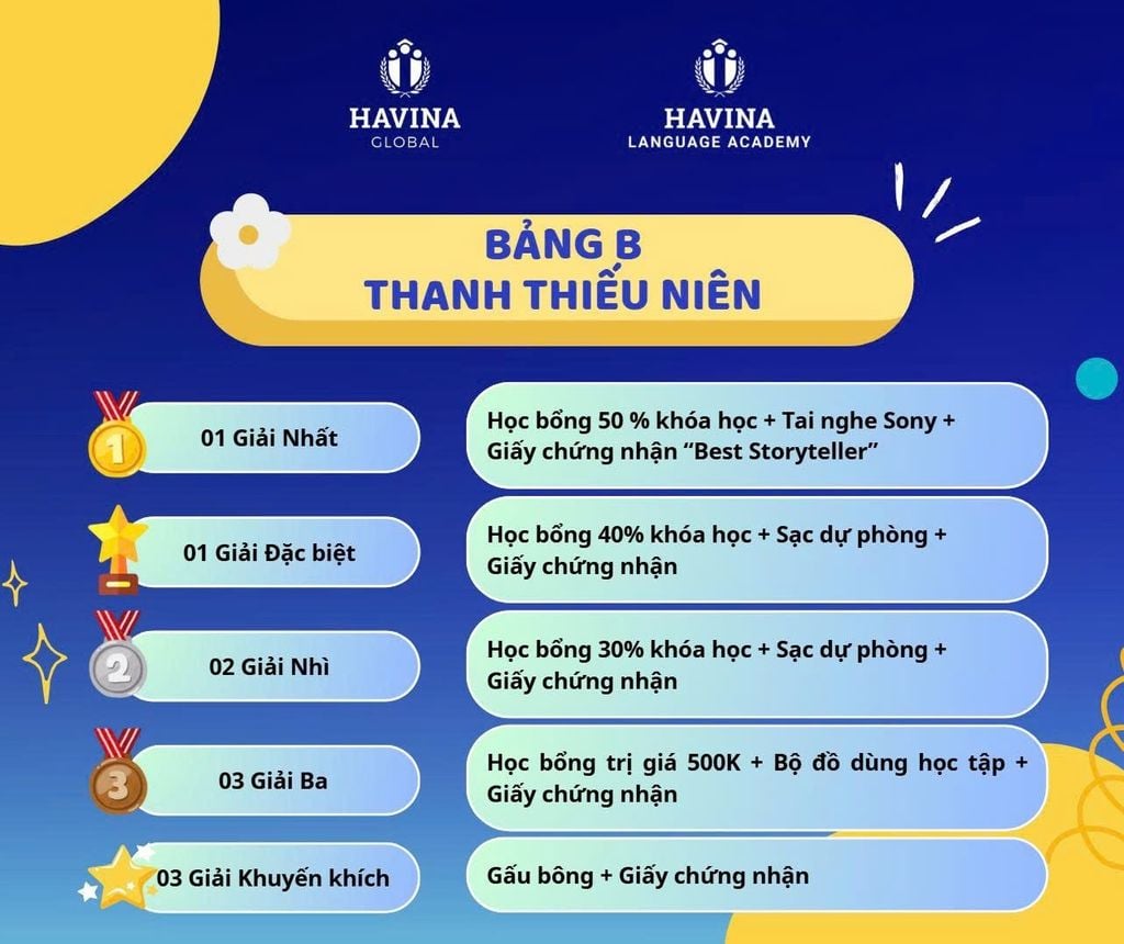 Cuộc thi mang đến bộ giải thưởng siêu hấp dẫn và là cơ hội để các bạn học viên Havina tỏa sáng như những “Storytelling Stars” – kể câu chuyện của chính mình bằng giọng nói, ánh mắt và trái tim.