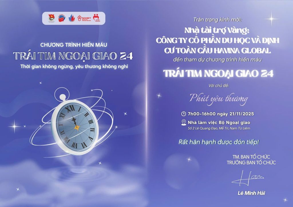 Ngày 21/11/2025, Havina Global vinh dự trở thành Nhà Tài Trợ Vàng của chương trình hiến máu “Trái tim Ngoại giao 24” – sự kiện nhân văn thường niên do Đội Thanh niên Vận động Hiến máu Học viện Ngoại giao phối hợp cùng Đoàn Thanh niên Bộ Ngoại giao và Viện Huyết học – Truyền máu TW tổ chức.
