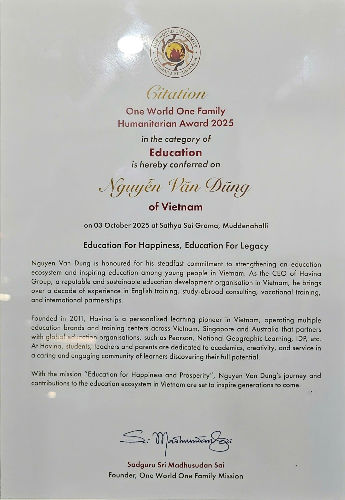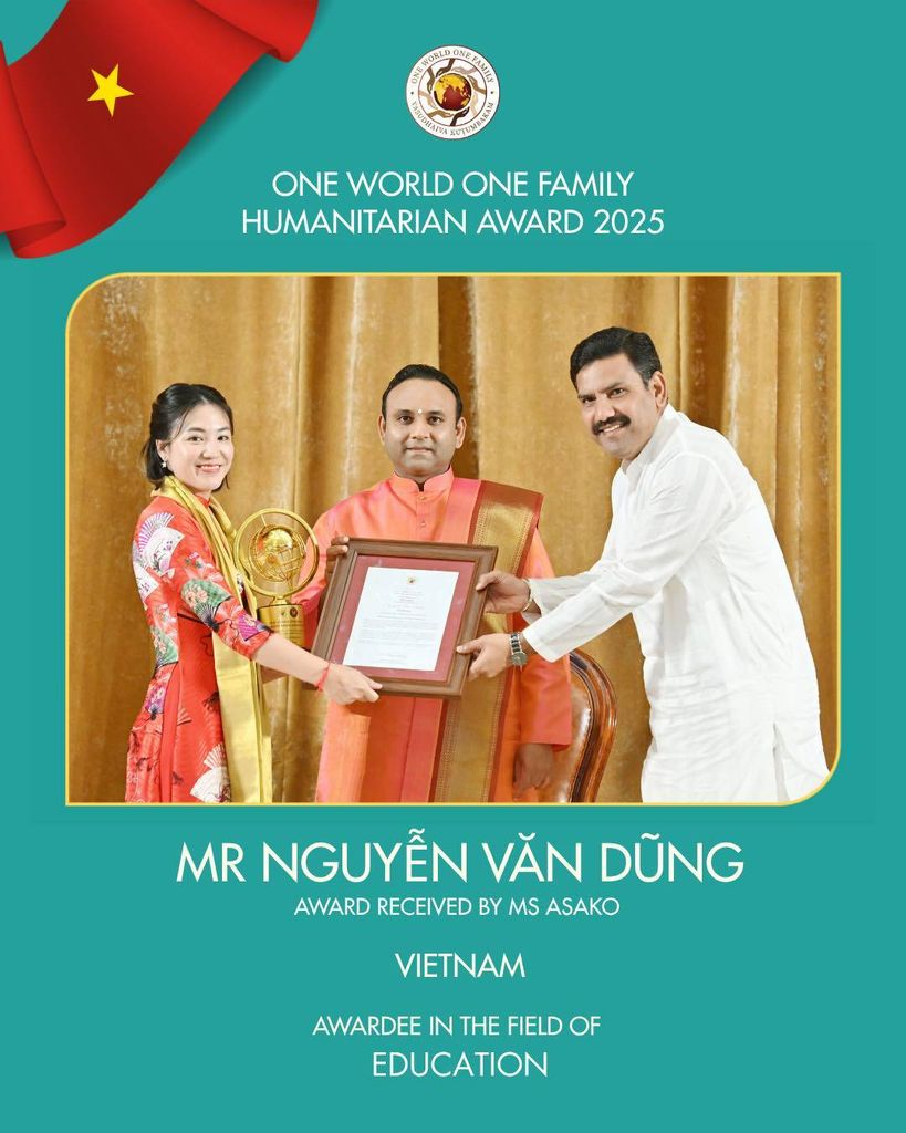 Tháng 11/2025, trong khuôn khổ One World One Family – World Cultural Festival 2025 tổ chức tại Sathya Sai Grama, Ấn Độ, thầy Nguyễn Văn Dũng (Leo) – Chủ tịch Sáng lập & Điều hành Hệ sinh thái Giáo dục & Nghề nghiệp Havina Group với sứ mệnh Giáo dục vì sự Hạnh phúc & Thịnh vượng – được vinh danh với Global Humanitarian Award cho những đóng góp to lớn trong việc mở rộng cơ hội tiếp cận giáo dục và phát triển nghề nghiệp cho thanh thiếu niên Việt Nam.