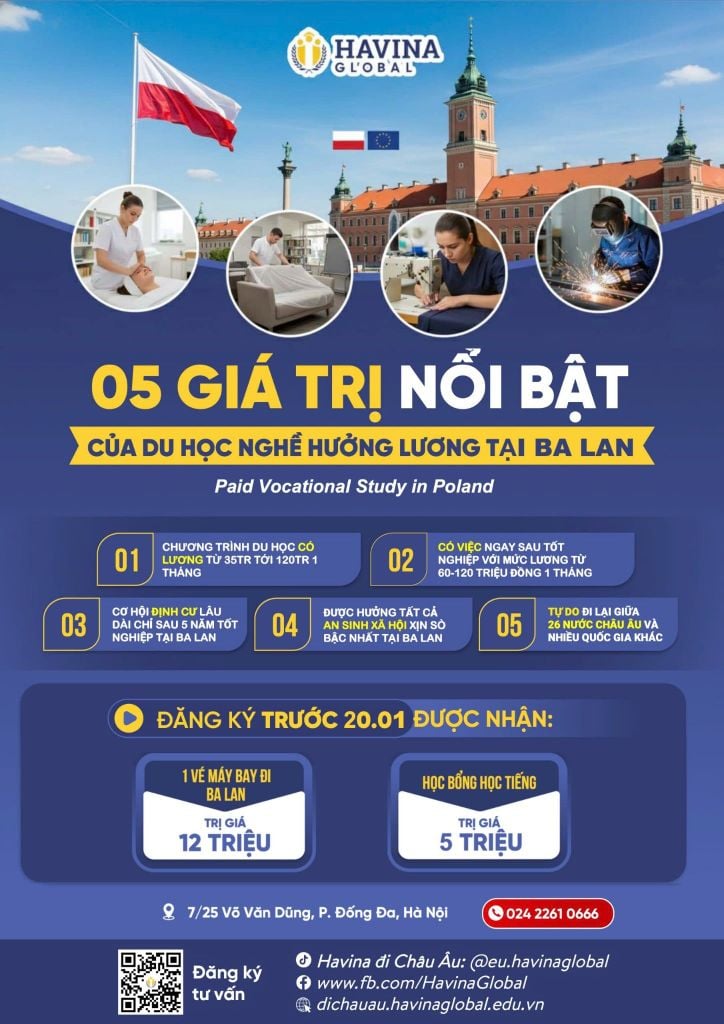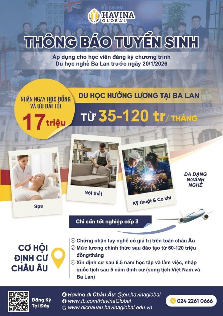 👉 THÔNG BÁO TUYỂN SINH DU HỌC NGHỀ HƯỞNG LƯƠNG TẠI BA LAN NĂM 2026