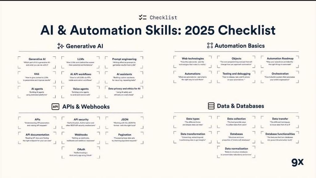 Trong bài viết này, chúng ta sẽ khám phá top kỹ năng AI & Automation quan trọng nhất năm 2025, được chia thành 4 nhóm chính: Generative AI, Automation Basics, APIs & Webhooks, và Data & Databases.
