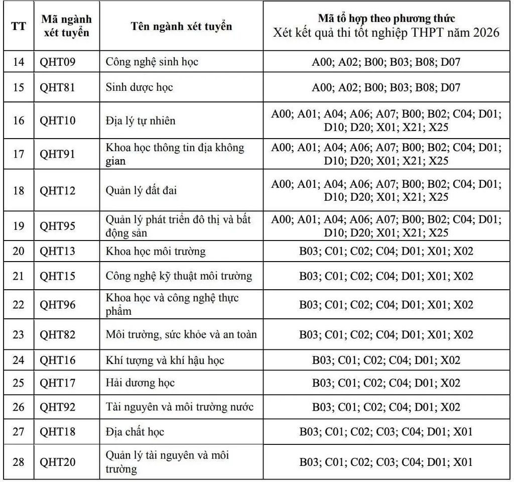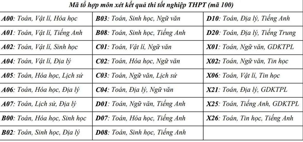 Bỏ một số tổ hợp so với năm 2025 như B01 (Toán – Sinh – Sử), D09 (Toán – Sử – Anh) và các tổ hợp có môn Giáo dục kinh tế & pháp luật, Tin học, Công nghệ.