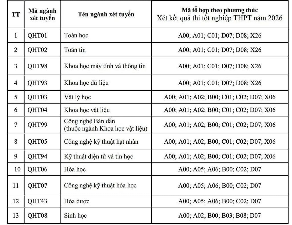 Năm 2026, Trường Đại học Khoa học Tự nhiên dự kiến triển khai 6 phương thức xét tuyển, đồng thời điều chỉnh số lượng tổ hợp xét tuyển theo điểm thi tốt nghiệp THPT so với năm trước. Những thay đổi này nhằm tinh gọn, phù hợp hơn với định hướng đào tạo và chất lượng đầu vào.